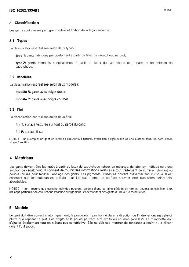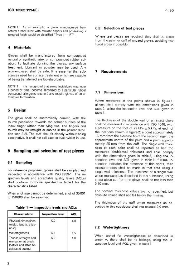 ISO 10282:1994 is a standard published by the International Organization for Standardization (ISO). Its full title is "Single-use sterile surgical rubber gloves — Specification". This standard covers: Specifies requirements for packaged sterile gloves intended for use in surgical procedures to protect the patient and the user from cross-contamination. Applicable to single-use gloves that are worn once and then discarded. Does not apply to examination or procedure gloves. Intended as a reference for the performance and safety of rubber surgical gloves.