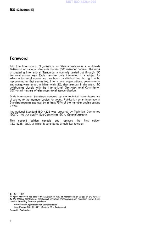 ISO 4226:1993 is a standard published by the International Organization for Standardization (ISO). Its full title is "Air quality — General aspects — Units of measurement". This standard covers: Lays down the units and symbols to be used when reporting results of measurements. For general guidance on the International System of Units, reference should be made to ISO 1000-1992.