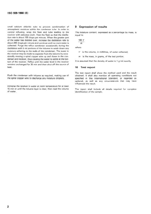 ISO 939:1980 is a standard published by the International Organization for Standardization (ISO). Its full title is "Spices and condiments — Determination of moisture content — Entrainment method". This standard covers: Specifies a method consisting in determining the amount of water entrained by azeotropic distillatiom, using an organic liquid immiscible with water, and collected in a graduated tube. Lists the apparatus to be used and describes sampling, procedure, expression of results and the details to be included in the test report. An example of an entrainment distillation apparatus is given in an annex.