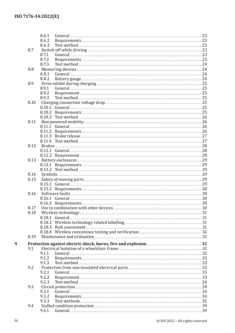ISO 7176-14:2022 is a document that outlines the requirements and test methods for power and control systems of electric wheelchairs and scooters. It establishes safety and performance standards for normal use as well as certain abuse and failure scenarios. The document also specifies methods for measuring the forces required to operate controls and sets limits on the forces needed for certain operations. It applies to electric wheelchairs and scooters with a maximum speed of 15 km/h, designed to provide indoor and/or outdoor mobility for a single disabled individual within a specified mass range.