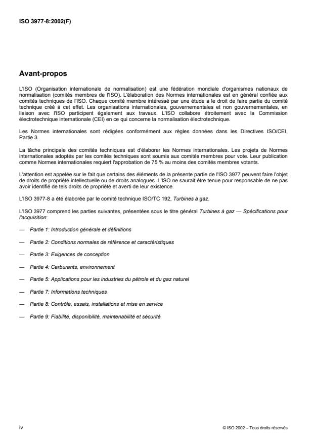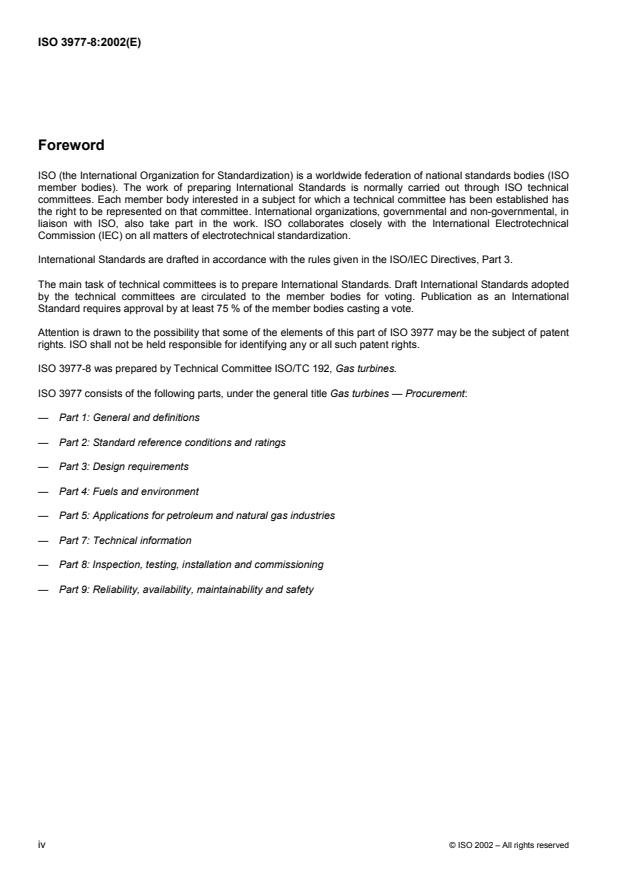 ISO 3977-8:2002 is a standard published by the International Organization for Standardization (ISO). Its full title is "Gas turbines - Procurement - Part 8: Inspection, testing, installation and commissioning". This standard covers: This part of ISO 3977 states the principles for systems and procedures to assure the integrity of a packager's product and services. It gives guidance on the inspection, testing, installation and commissioning required for the package and packaged equipment. It outlines the responsibilities between the purchaser and packager for inspection, coordination, reporting and recording.