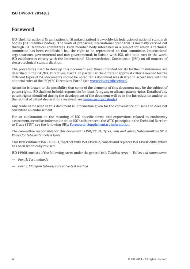ISO 14960-1:2014 is a standard published by the International Organization for Standardization (ISO). Its full title is "Tubeless tyres — Valves and components — Part 1: Test methods". This standard covers: ISO 14960-1:2014specifies test methods for snap-in tubeless tyre valves intended for, but are not limited to, highway applications.
