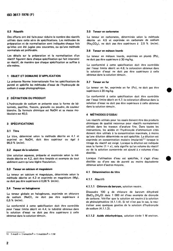 ISO 3617:1976 - Hydroxyde de sodium de qualité photographique -- Spécifications
