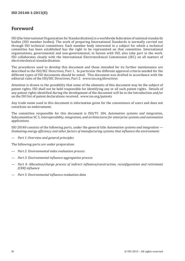 ISO 20140-1:2013 is a standard published by the International Organization for Standardization (ISO). Its full title is "Automation systems and integration — Evaluating energy efficiency and other factors of manufacturing systems that influence the environment — Part 1: Overview and general principles". This standard covers: ISO 20140-1:2013 establishes an overview and general principles of a method for the assessment of environmental influence of manufacturing systems. ISO 20140 specifies for the discrete products/parts manufacturing sectors a common foundation and methodology for energy efficiency and other factors of environmental influence evaluation, which enables sector specific methods to be applied in characteristic situations. ISO 20140 enables an assessment to be made of the environmental influence of manufacturing processes, which can be used either to seek an overall reduction in negative influence or an increase in positive results. The evaluation method of ISO 20140 is applicable to the environmental influence of a manufacturing system which consists of individual manufacturing equipment, and which is configured as a work unit, a work centre, an area or a factory. ISO 20140 specifies the requirements for the environmental influence data to be captured from the individual manufacturing equipment, as the most granular data for aggregating along the manufacturing system hierarchy. The following are outside the scope of ISO 20140: the environmental influence evaluation methodology of systems outside the manufacturing system boundaries (e.g. other systems of the same site or other systems of the entire enterprise); the environmental influence evaluation methodology to handle the complete product life cycle; the method and data for environmental evaluation which are specific to a particular industry sector, manufacturer, or machinery.
