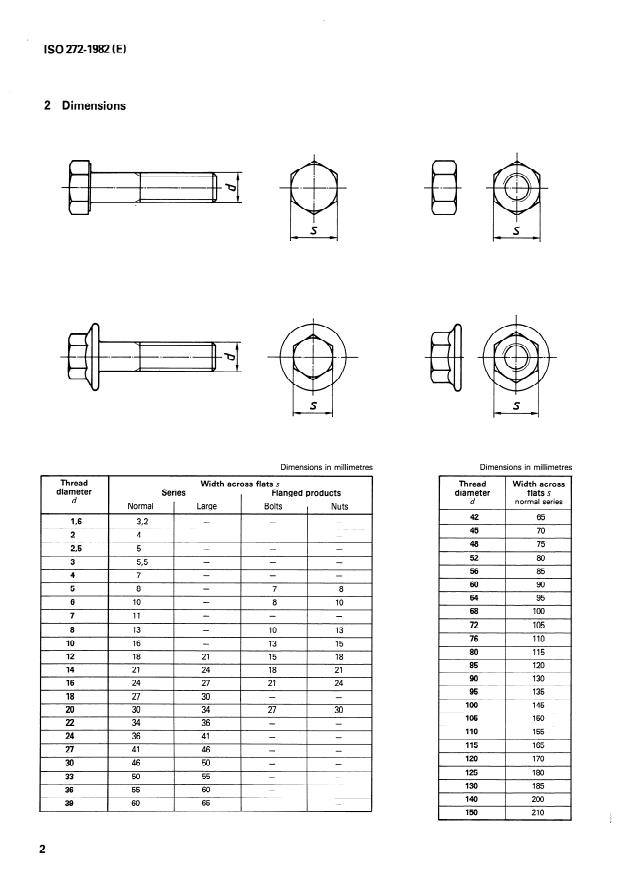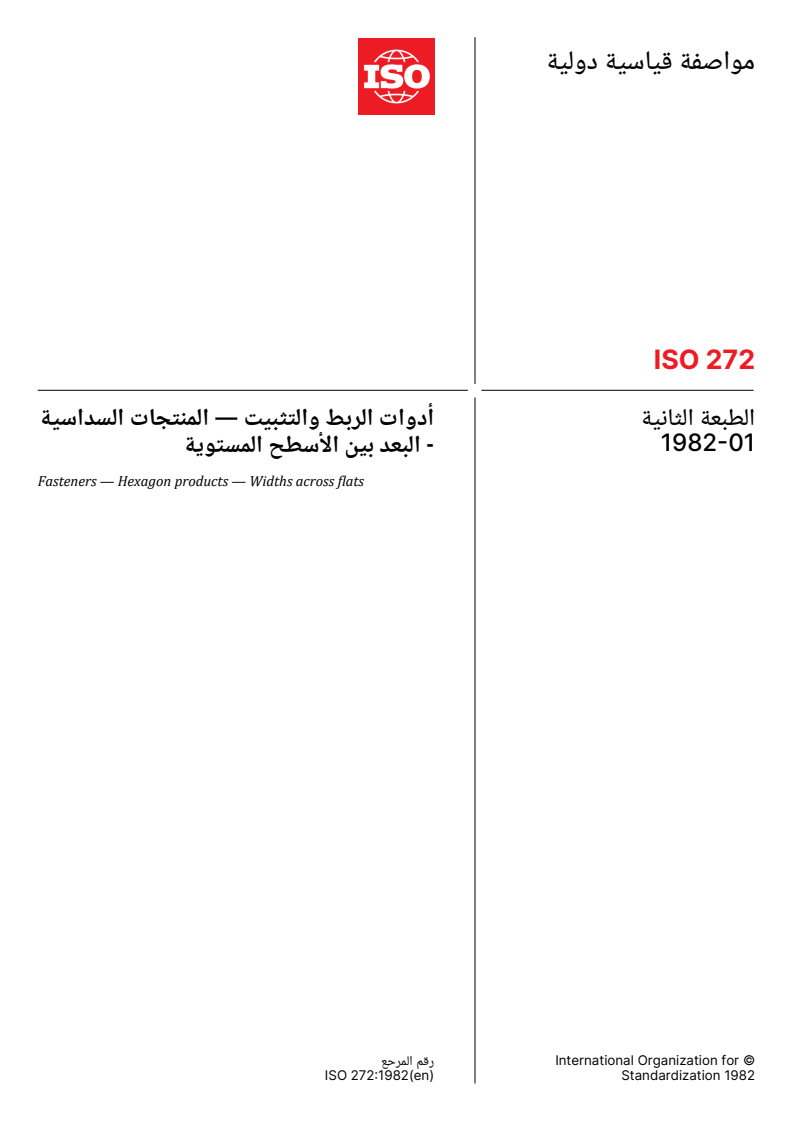 ISO 272:1982 is a standard published by the International Organization for Standardization (ISO). Its full title is "Fasteners - Hexagon products - Widths across flats". This standard covers: Specifies the widths to be used in the respective product standards; it sets out a logical ratio between underhead (or nut) bearing area and the tensile stress area of the screw thread.