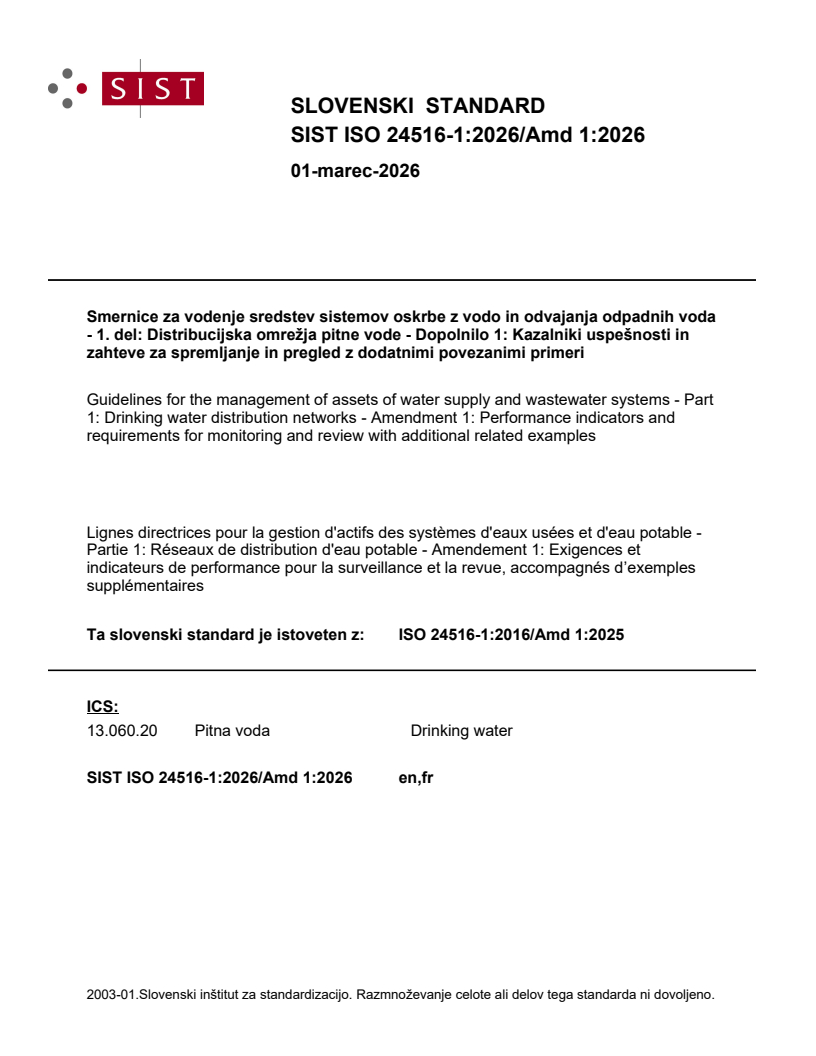 ISO 24516-1:2016/Amd 1:2025 - Guidelines for the management of assets of water supply and wastewater systems — Part 1: Drinking water distribution networks — Amendment 1: Performance indicators and requirements for monitoring and review with additional related examples Released:9/16/2025