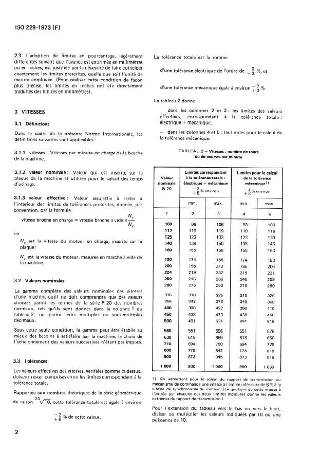 ISO 229:1973 is a standard published by the International Organization for Standardization (ISO). Its full title is "Machine tools - Speeds and feeds". This standard covers: Lya down the speeds (number of revolutions or strokes per minute) and the feeds (in millimetres or in inches, per minute, per revolution, or per stroke) of machine tools working by removal of metal an driven directly by an electrical motor. Is not applicable to machines with continuous speed variations, feeds for thread forming, etc.