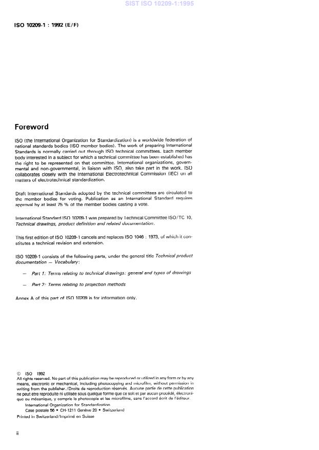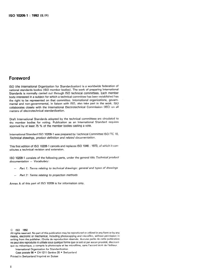ISO 10209-1:1992 is a standard published by the International Organization for Standardization (ISO). Its full title is "Technical product documentation — Vocabulary — Part 1: Terms relating to technical drawings: general and types of drawings". This standard covers: Includes 34 terms and definitions in English and French. Annex A gives the equivalent terms in the German, Italian and Swedish languages for information only.