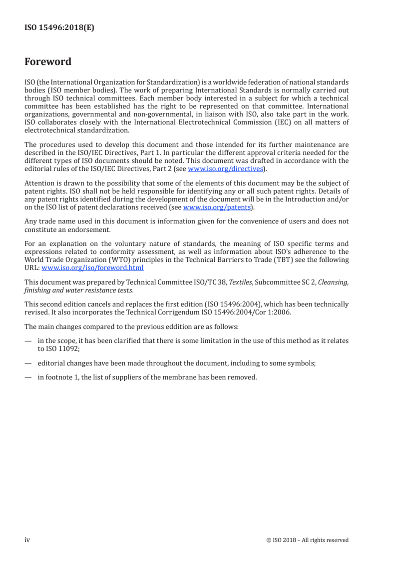 ISO 15496:2018 is a standard published by the International Organization for Standardization (ISO). Its full title is "Textiles — Measurement of water vapour permeability of textiles for the purpose of quality control". This standard covers: ISO 15496:2018 describes a comparatively simple method for testing the water vapour permeability of textiles that will provide the manufacturer with a clearly recognized method for quality control within the plant. The simple test method described in this document is not applicable for classifying the water vapour resistance of textiles against values relating to physiological effects specified in product standards, and particularly not those relating to personal protective equipment. The method can be used for quality control but has some limitation in relation to ISO 11092, which gives a more comprehensive and relevant result for evaluation of water vapour penetration. Annex A provides further explanation of applicability. ISO 15496:2018 cannot be used to compare results to other "dry dessicant" methods as they will not correlate. An explanation of the reasons can be found in Annex C.