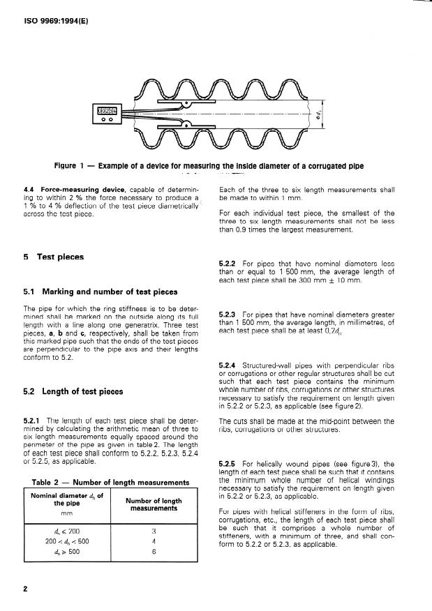 ISO 9969:1994 is a standard published by the International Organization for Standardization (ISO). Its full title is "Thermoplastics pipes — Determination of ring stiffness". This standard covers: The principle of the method specified is vertically compressing a length of pipe supported horizontally between two parallel flat plates moved at a constant speed which is dependent upon the diameter of the pipe, measuring the force and the deflection, plotting the force versus deflection, and calculating the ring stiffness as a function of the force necessary to produce a deflection of 0,03 nominal diameter diametrically across the pipe. Applies to pipes having a circular cross-section.