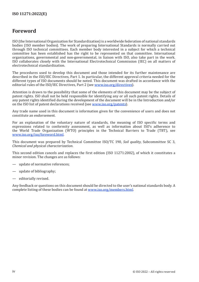 ISO 11271:2022 is a standard published by the International Organization for Standardization (ISO). Its full title is "Soil quality - Determination of redox potential - Field method". This standard covers: This document specifies a field method for the determination of soil redox potential (Eh). NOTE The electrochemical measurement of redox potential described in this document is possible only if the relevant soil horizon has a moisture status defined as fresh or wetter according to the classes presented in Annex D.