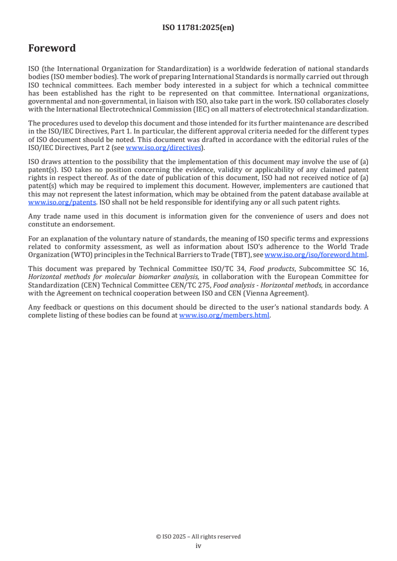 ISO 11781:2025 is a standard published by the International Organization for Standardization (ISO). Its full title is "Molecular biomarker analysis - Requirements and guidance for single-laboratory validation of qualitative real-time polymerase chain reaction (PCR) methods". This standard covers: This document specifies minimum requirements and minimum performance criteria for conducting a single-laboratory validation study for qualitative (binary) real-time polymerase chain reaction (PCR) methods applied to the detection of specific DNA sequences present in foods. The document is applicable to any single-laboratory validation of a qualitative real-time PCR method used for the detection of specific DNA sequences in food and food products (e.g. for the detection of genetically modified foodstuffs and for species determination, including species known to produce allergenic proteins). The document does not apply to single laboratory validation of qualitative microbiological real-time PCR methods. The document does not apply to the evaluation of applicability and practicability with respect to the specific scope of the PCR method.