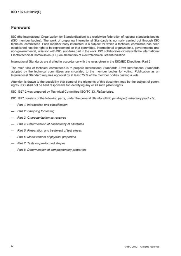 ISO 1927-2:2012 is a standard published by the International Organization for Standardization (ISO). Its full title is "Monolithic (unshaped) refractory products - Part 2: Sampling for testing". This standard covers: ISO 1927-2:2012 gives guidance on the sampling of monolithic (unshaped) refractory materials for the purpose of inspection and testing for quality and general information on the reduction and treatment of samples prior to testing. It covers all materials formulated as monolithic refractory materials.