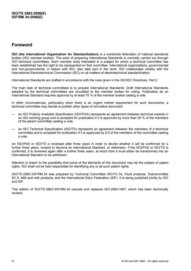 ISO/TS 2963:2006 (IDF/RM 34:2006) is a joint ISO–IDF Technical Specification that specifies an enzymatic method for determining citric acid content in cheese and processed cheese products. Published in 2006, it replaces earlier editions and provides a validated laboratory procedure for quantitative measurement of citric acid expressed as a mass fraction (percent).