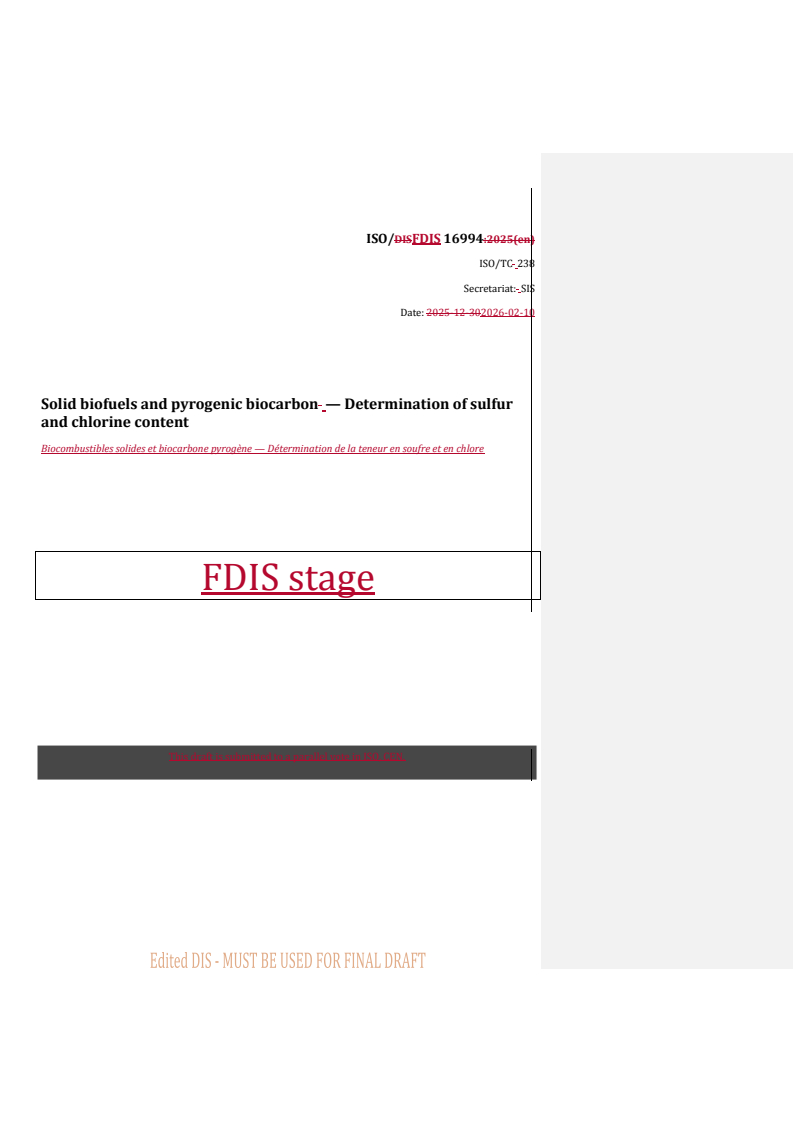 REDLINE ISO/FDIS 16994 - Solid biofuels and pyrogenic biocarbon — Determination of sulfur and chlorine content/10/2026
