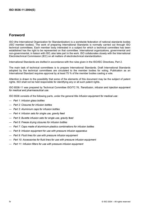 ISO 8536-11:2004 is a standard published by the International Organization for Standardization (ISO). Its full title is "Infusion equipment for medical use — Part 11: Infusion filters for use with pressure infusion equipment". This standard covers: ISO 8536-11:2004 applies to sterilized infusion filters for single use up to 200 kPa (2 bar) on fluid lines of pressure infusion equipment and infusion set as specified in ISO 8536-8. It does not include the effectiveness of filters for separation of particles or germs.