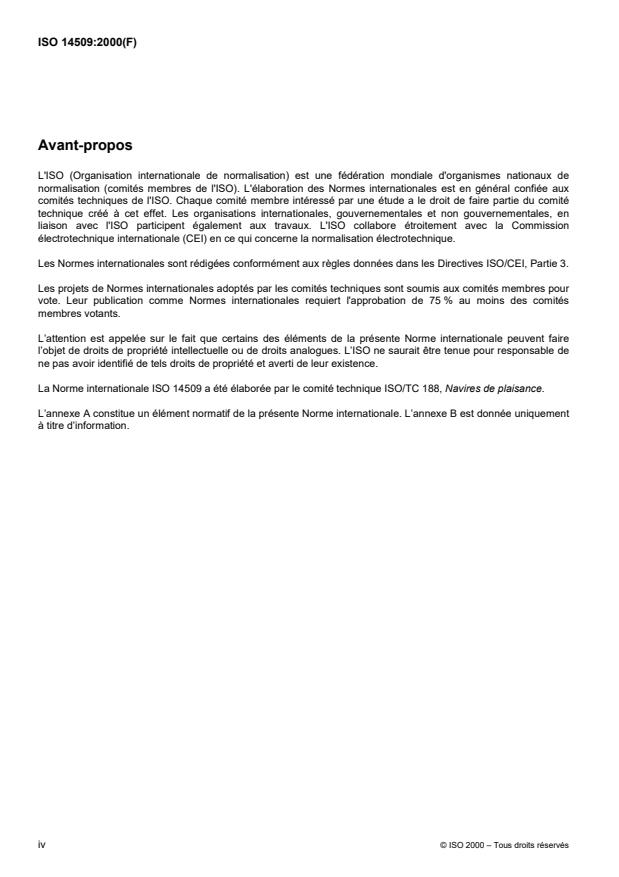 ISO 14509:2000 is a standard published by the International Organization for Standardization (ISO). Its full title is "Small craft - Measurement of airborne sound emitted by powered recreational craft". This standard covers: La présente Norme internationale spécifie les conditions d'obtention de résultats de mesures reproductibles et comparables du niveau de pression acoustique maximal du bruit aérien provoqué par le passage des navires de plaisance motorisés dont la coque ne dépasse pas 24 m de longueur, y compris les moteurs intérieurs, arrière, scooter de mer et les moteurs hors-bord utilisés avec un navire type. Si l'on souhaite déterminer, outre le niveau de pression acoustique maximal, le niveau d'exposition acoustique, celui-ci doit être mesuré selon la méthode spécifiée à l'annexe A. NOTE L'ISO 2922 s'applique aux mesurages de l'émission de bruit pour les navires autres que ceux spécifiés ci-dessus. La classe de précision des modes opératoires d'essais acoustiques spécifiés dans la présente Norme internationale est la classe 2 (expertise) définie dans l'ISO 12001. Voir aussi l'article 6.