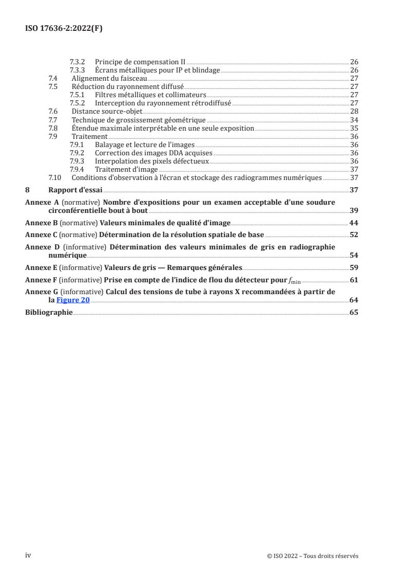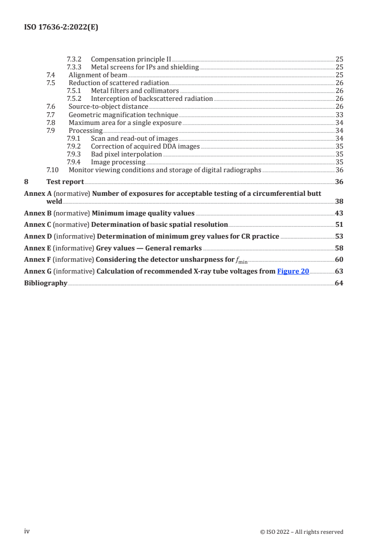 - Reporting and annexes: Required test-report content and informative/ normative annexes covering number of exposures, minimum image quality values, spatial resolution, grey-value considerations and detector unsharpness.