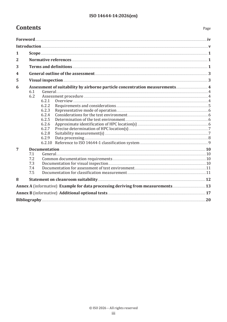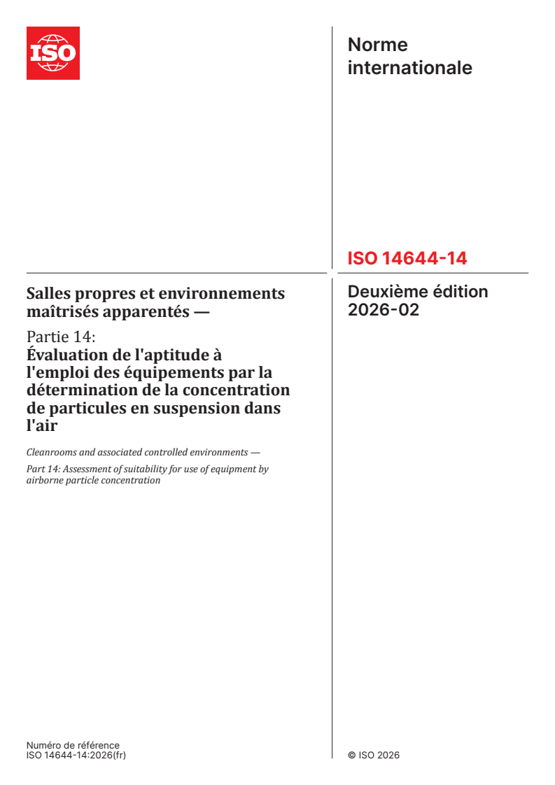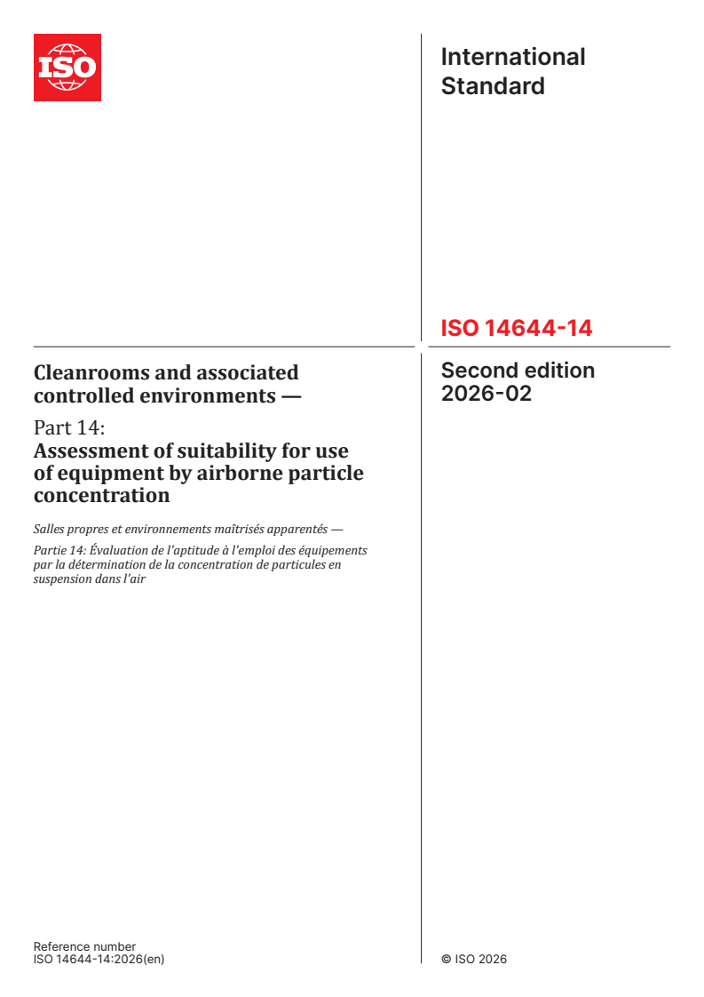 ISO 14644-14:2026 - Cleanrooms and associated controlled environments — Part 14: Assessment of suitability for use of equipment by airborne particle concentration