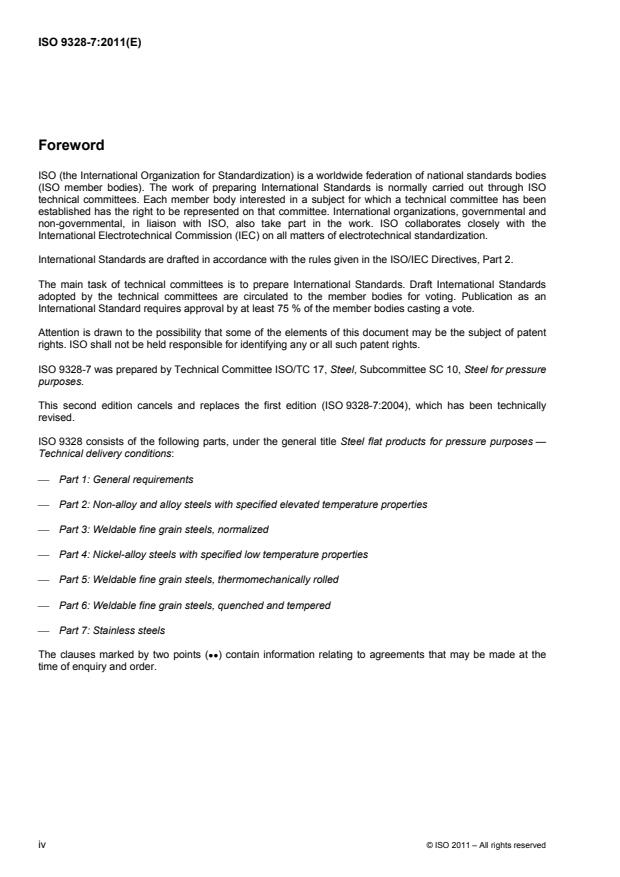 ISO 9328-7:2011 is a standard published by the International Organization for Standardization (ISO). Its full title is "Steel flat products for pressure purposes — Technical delivery conditions — Part 7: Stainless steels". This standard covers: ISO 9328-7:2011 specifies requirements for flat products for pressure purposes made of stainless steels, including austenitic creep-resisting steels. Additionally the requirements of ISO 9328-1:2011 also apply.