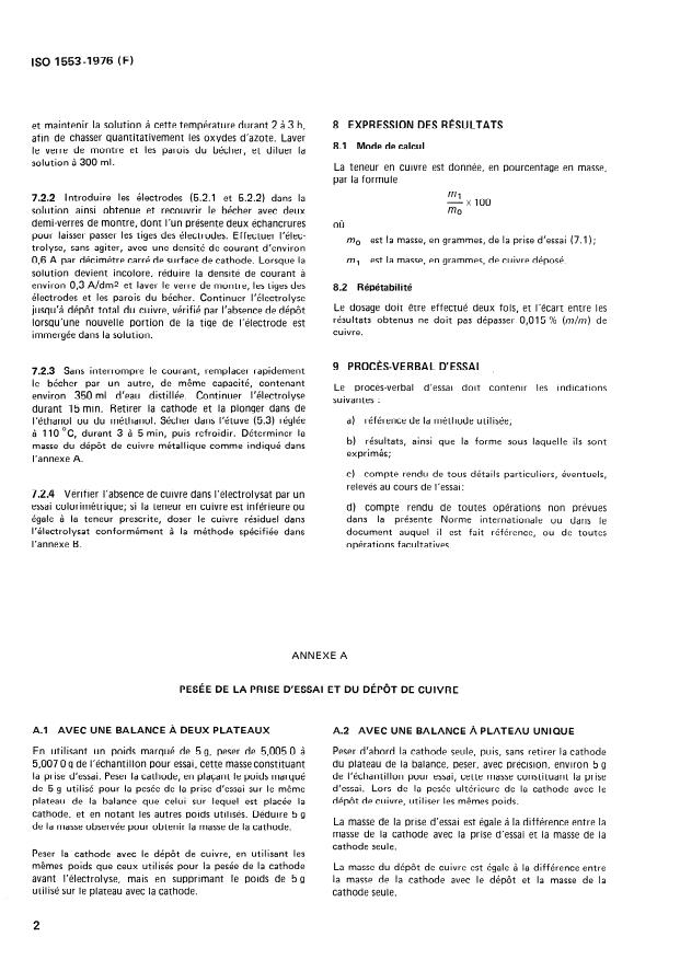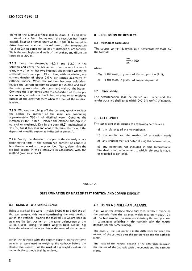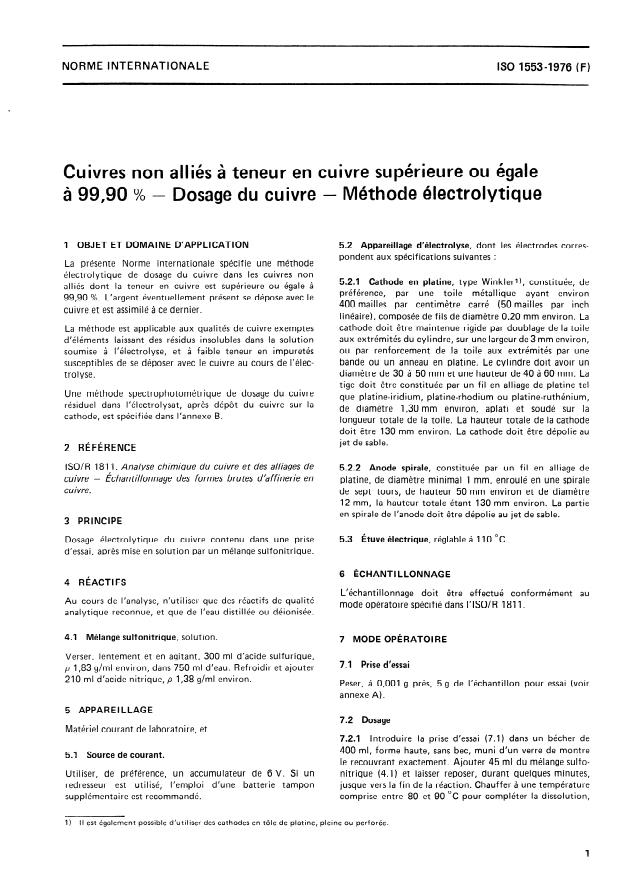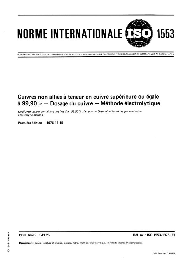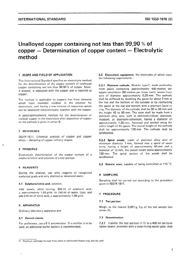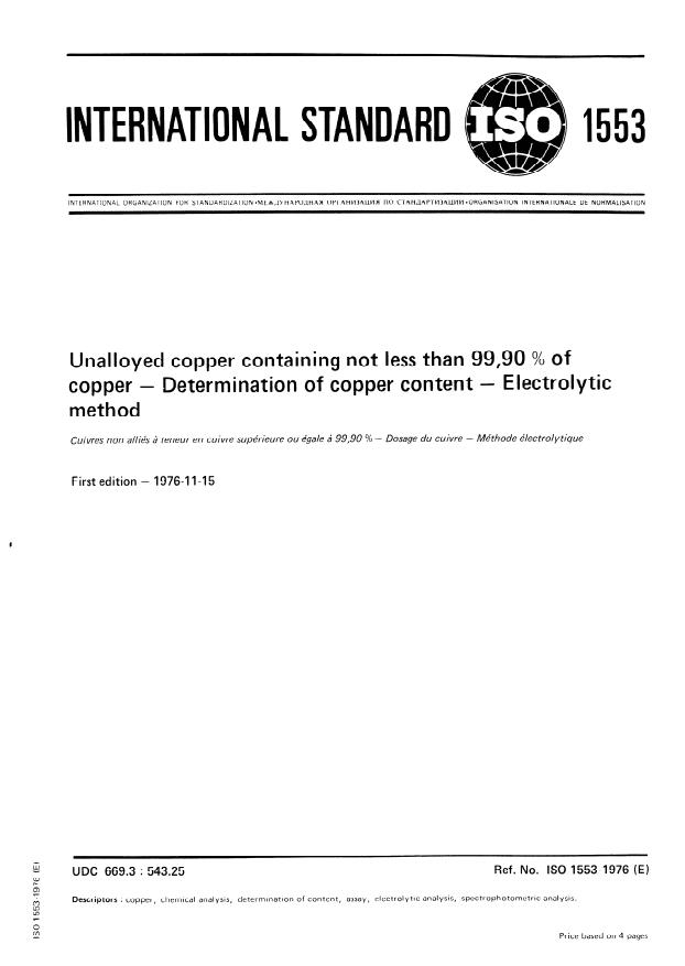 ISO 1553:1976 is a standard published by the International Organization for Standardization (ISO). Its full title is "Unalloyed copper containing not less than 99,90 % of copper — Determination of copper content — Electrolytic method". This standard covers: The method is applicable to unalloyed coppers not containing elements providing insoluble residues in the electrolytic solution. Annex A gives test portions of test sample and of copper precipitate. Annex B describes a spectrophotometric method for the determination of residual copper in the electrolytic solution after deposition of copper on the cathode.