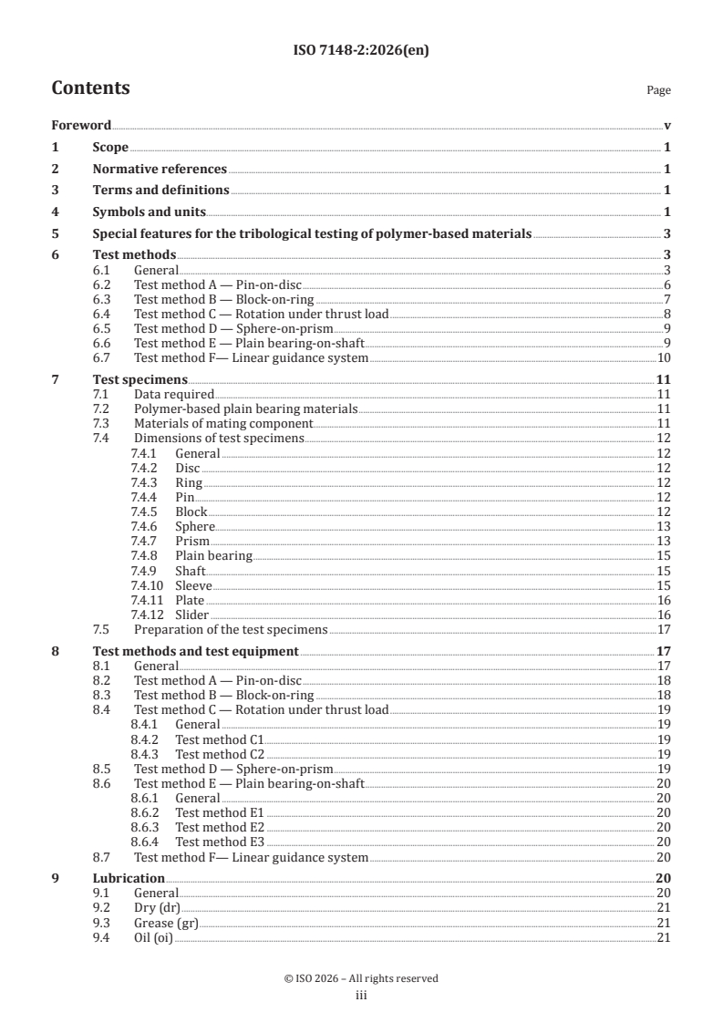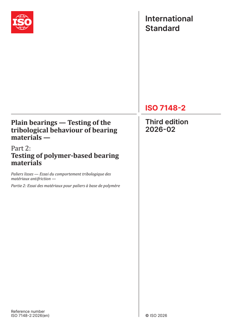 ISO 7148-2:2026 is a standard published by the International Organization for Standardization (ISO). Its full title is "Plain bearings — Testing of the tribological behaviour of bearing materials — Part 2: Testing of polymer-based bearing materials". This standard covers: This document specifies tribological tests of polymer-based plain bearing materials under specified working conditions, i.e. load, sliding velocity and temperature, with and without lubrication. From the test results, data are obtained which indicate the relative tribological behaviour of metal-polymer and polymer-polymer rubbing parts. The purpose of this document is to obtain, for polymer material combinations used in plain bearings, reproducible measured values for friction and wear under specified and exactly-defined test conditions without lubrication (dry surfaces) and with lubrication (boundary lubrication).