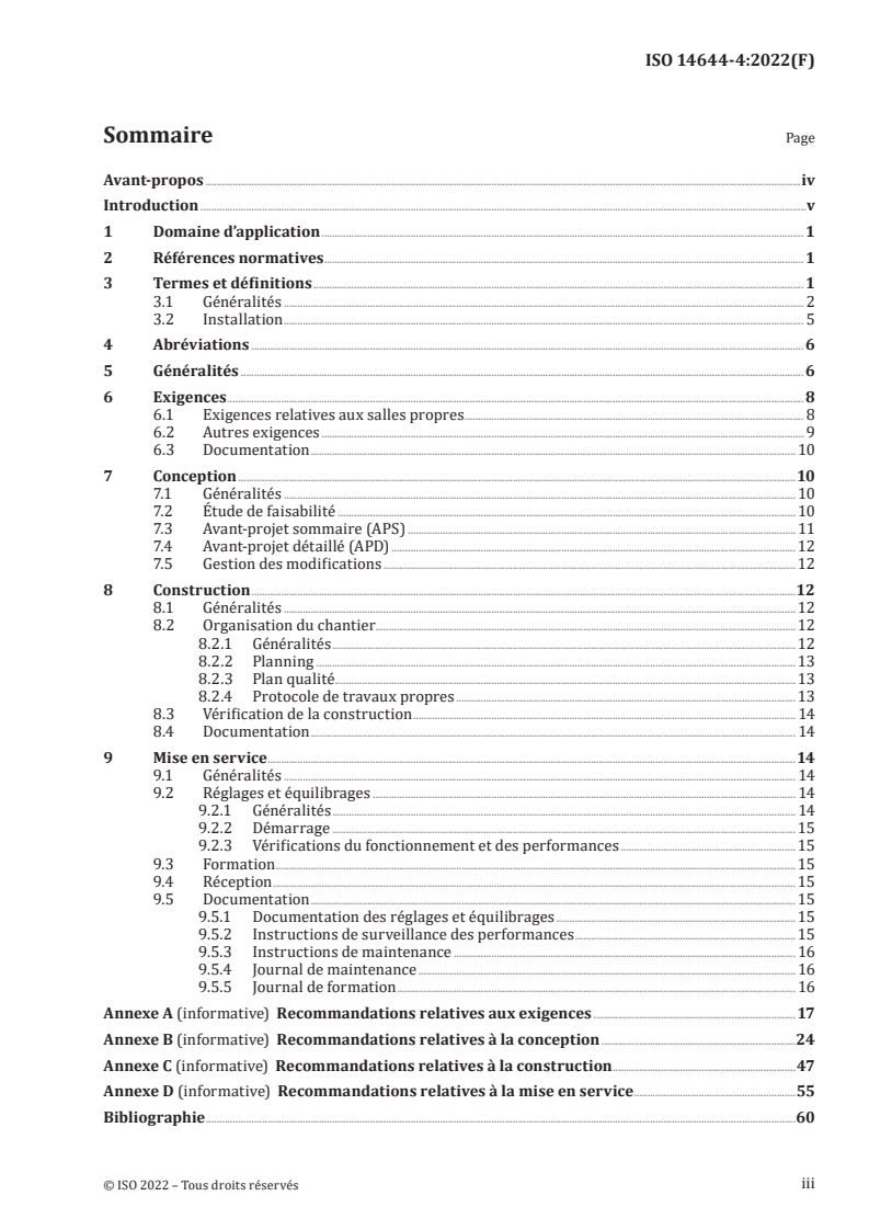Le présent document spécifie le processus de création d’une salle propre allant des exigences jusqu’à la conception, la construction et la mise en service. Il s’applique aux installations de salles propres nouvelles, rénovées ou modifiées. Il ne prescrit pas de moyens technologiques ou contractuels spécifiques pour satisfaire à ces exigences. Il est destiné aux utilisateurs, prescripteurs, concepteurs, acheteurs, fournisseurs, constructeurs et vérificateurs des performances d’installations de salles propres. La principale considération en matière de propreté est la concentration particulaire de l’air. Des listes de contrôle détaillées sont fournies pour les différentes étapes: les exigences, la conception, la construction et la mise en service. Celles-ci comprennent les paramètres de performance importants à prendre en compte. Des approches de conception basées sur le management de l’énergie sont identifiées afin de permettre une conception de salle propre efficace sur le plan énergétique. Des recommandations en matière de construction sont fournies, incluant des exigences pour la mise en service et la vérification. L’un des principaux éléments du présent document concerne les aspects à prendre en considération, maintenance comprise, qui sont destinés à garantir un fonctionnement constant satisfaisant pendant tout le cycle de vie de la salle propre. NOTE D’autres recommandations sont données dans les Annexes A à D. L’ISO 14644-1, l’ISO 14644-2, l’ISO 14644-8, l’ISO 14644-9, l’ISO 14644-10, l’ISO 14644-12 et l’ISO 14644-17 fournissent des informations complémentaires. L’ISO 14644-7 propose des recommandations relatives à la conception, à la construction et aux exigences spécifiques des dispositifs séparatifs (postes à air propre, boîtes à gants, isolateurs et mini‑environnements). Les sujets suivants sont mentionnés, mais non traités dans le présent document: — des activités opérationnelles spécifiques, des procédés spécifiques et équipements de procédé à héberger dans l’installation de salle propre; — réglementations de sécurité et de protection incendie; — activités courantes d’exploitation, de nettoyage et de maintenance, traitées dans l’ISO14644-5.