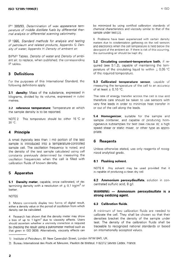 ISO 12185:1996 is a standard published by the International Organization for Standardization (ISO). Its full title is "Crude petroleum and petroleum products — Determination of density — Oscillating U-tube method". This standard covers: Gives a method for the determination, using an oscillation U-tube densitometer, of the density of crude petroleum and related products within the range 600 kg/m^3 to 1 100 kg/m^3 which can be handled as single-phase liquids at the test temperature and pressure.