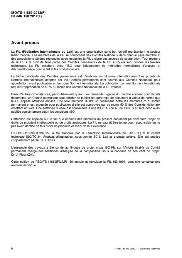 ISO/TS 11869:2012 - Laits fermentés -- Détermination de l'acidité titrable -- Méthode potentiométrique