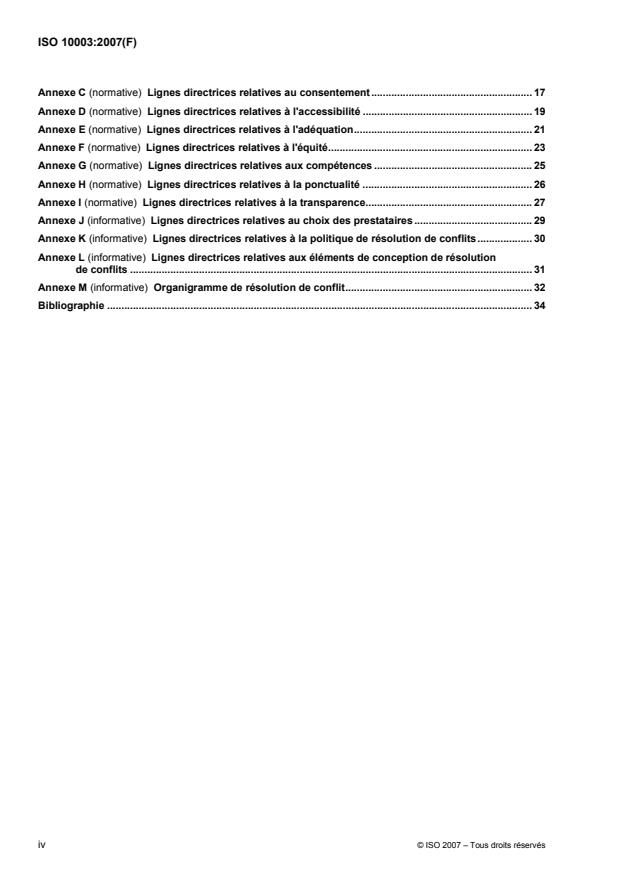 L'ISO 10003:2007 fournit à un organisme des lignes directrices relatives à la planification, à la conception, à l'élaboration, au fonctionnement, à l'entretien et à l'amélioration d'un processus de résolution de conflits efficace et efficient concernant les réclamations non résolues par l'organisme. L'ISO 10003:2007 est applicable aux réclamations concernant les produits de l'organisme destinés ou nécessaires aux clients, le processus de traitement des réclamations ou le processus de résolution des conflits, à la résolution de conflits résultants d'activités nationales et internationales, y compris ceux survenant dans le cadre du commerce électronique. L'ISO 10003:2007 est destinée à être utilisée par des organismes quel que soit leur type, leur taille et le produit fourni et aborde les lignes directrices déterminant le moment et le mode de participation des organismes à la résolution des conflits, les lignes directrices relatives à la sélection des prestataires et au recours à leurs services, l'implication et l'engagement de la direction dans la résolution des conflits ainsi que le déploiement des ressources appropriées au sein de l'organisme, les éléments essentiels pour une résolution de conflits équitable, appropriée, transparente et accessible, les lignes directrices relatives à la gestion de la participation d'un organisme à la résolution de conflits, et la surveillance, l'évaluation et l'amélioration du processus de résolution des conflits. L'ISO 10003:2007 n'est pas destinée à être utilisée à des fins de certification ou à des fins contractuelles. Elle ne s'applique pas à la résolution d'autres types de conflits comme les conflits relatifs à l'emploi. Elle n'est pas destinée à se substituer aux droits ou aux obligations définis dans des exigences légales ou réglementaires applicables. L'ISO 10003:2007 ne s'applique pas au traitement des réclamations au sein d'un organisme.