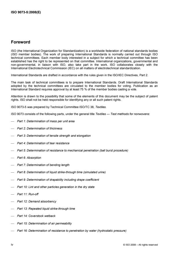 ISO 9073-5:2008 is a standard published by the International Organization for Standardization (ISO). Its full title is "Textiles - Test methods for nonwovens - Part 5: Determination of resistance to mechanical penetration (ball burst procedure)". This standard covers: ISO 9073-5:2008 specifies a method for determining the resistance to mechanical penetration of nonwoven fabrics by a ball of a given diameter. The method is primarily designed to be used on nonwovens with some degree of elasticity, for which a regular burst test is not applicable.
