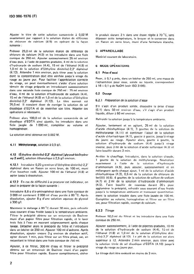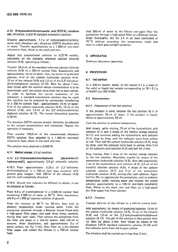 ISO 986:1976 is a standard published by the International Organization for Standardization (ISO). Its full title is "Sodium hydroxide for industrial use — Determination of calcium content — EDTA (disodium salt) complexometric method". This standard covers: The method is applicable to products having a calcium content equal to or greater than 0.002 % (m/m). The principle consists in titration of the calcium with a standard volumetric solution of the disodium salt of (ethylenedinitrilo)tetraacetic acid (EDTA disodium salt) in the presence of 2,2'-(ethylenedinitrilo)diphenol Äglyoxal-bis-(2-hydroxyanil)Ü as indicator, after elimination of impurities which may hinder the determination. - Replaces ISO Recommendation R 986-1969.