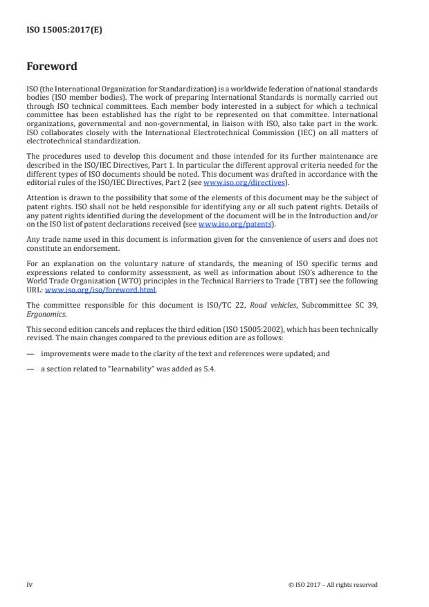 ISO 15005:2017 specifies ergonomic principles for the design of the dialogues that take place between the driver of a road vehicle and the vehicle's transport information and control systems (TICS) while the vehicle is in motion. It also specifies compliance verification conditions for the requirements related to these principles. ISO 15005:2017 is applicable to TICS consisting of either single or multiple devices, which can be either independent or interconnected. It is not applicable to TICS without dialogues, TICS failures or malfunctions, or controls or displays used for non-TICS functions. The requirements and recommendations of this document can be reconsidered for drivers with special needs.