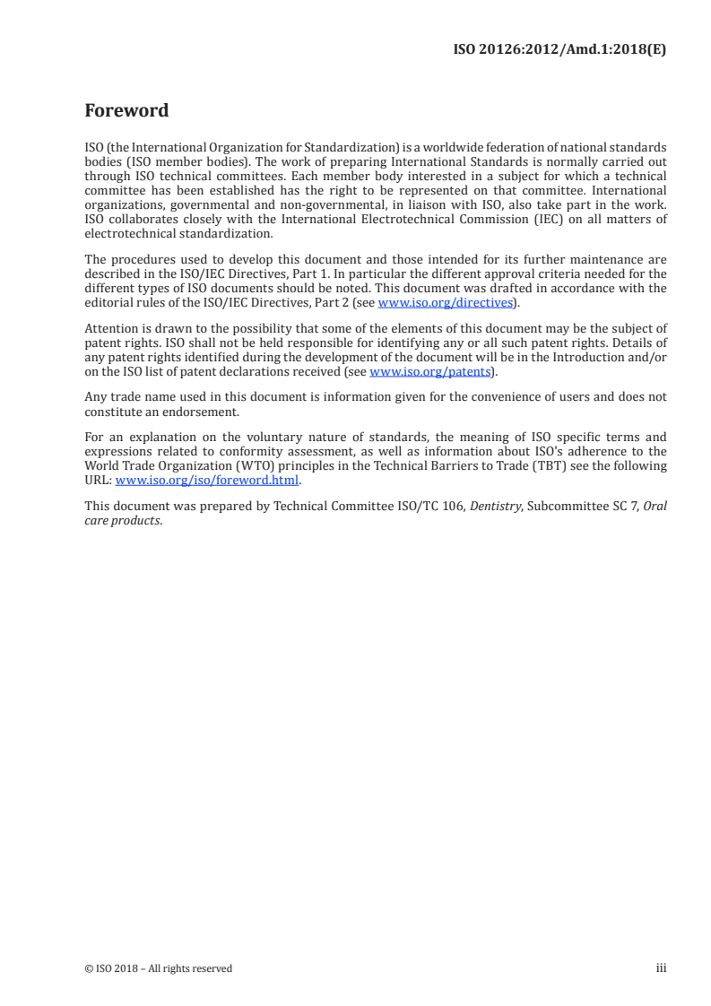 ISO 20126:2012/Amd 1:2018 is a standard published by the International Organization for Standardization (ISO). Its full title is "Dentistry — Manual toothbrushes — General requirements and test methods — Amendment 1". This standard covers: Dentistry — Manual toothbrushes — General requirements and test methods — Amendment 1