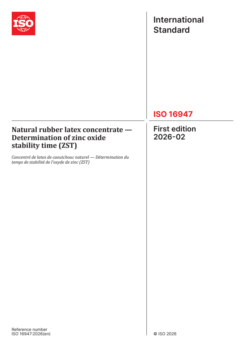 ISO 16947:2026 is a standard published by the International Organization for Standardization (ISO). Its full title is "Natural rubber latex concentrate — Determination of zinc oxide stability time (ZST)". This standard covers: This document specifies a method for determining the zinc oxide stability time (ZST) of natural rubber latex concentrate.