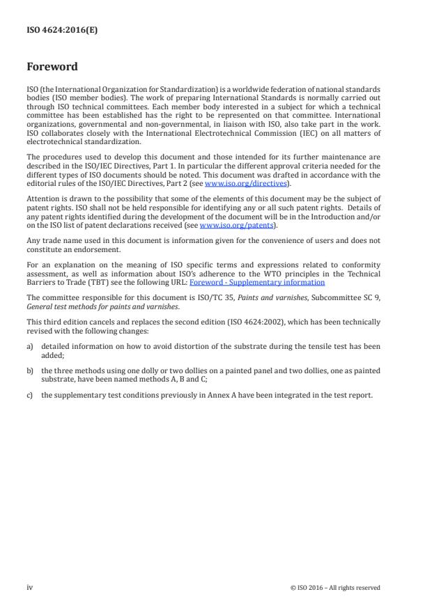 ISO 4624:2016 is a standard published by the International Organization for Standardization (ISO). Its full title is "Paints and varnishes — Pull-off test for adhesion". This standard covers: ISO 4624:2016 specifies three methods (i.e. one dolly or two dollies on a painted panel and two dollies, one as painted substrate) for determining the adhesion by carrying out a pull-off test on a single coating or a multi-coat system of paint, varnish or related product. These test methods have been found useful in comparing the adhesion behaviour of different coatings. It is most useful in providing relative ratings for a series of coated panels exhibiting significant differences in adhesion. The test may be applied using a wide range of substrates. Different procedures are given according to whether the substrate is deformable, for example thin metal, plastics and wood, or rigid, for example thick concrete and metal plates. To avoid distortion of the substrate during the tensile test, it is common to use a sandwich construction. For example, for special purposes, the coating may be applied directly to the face of a test dolly.