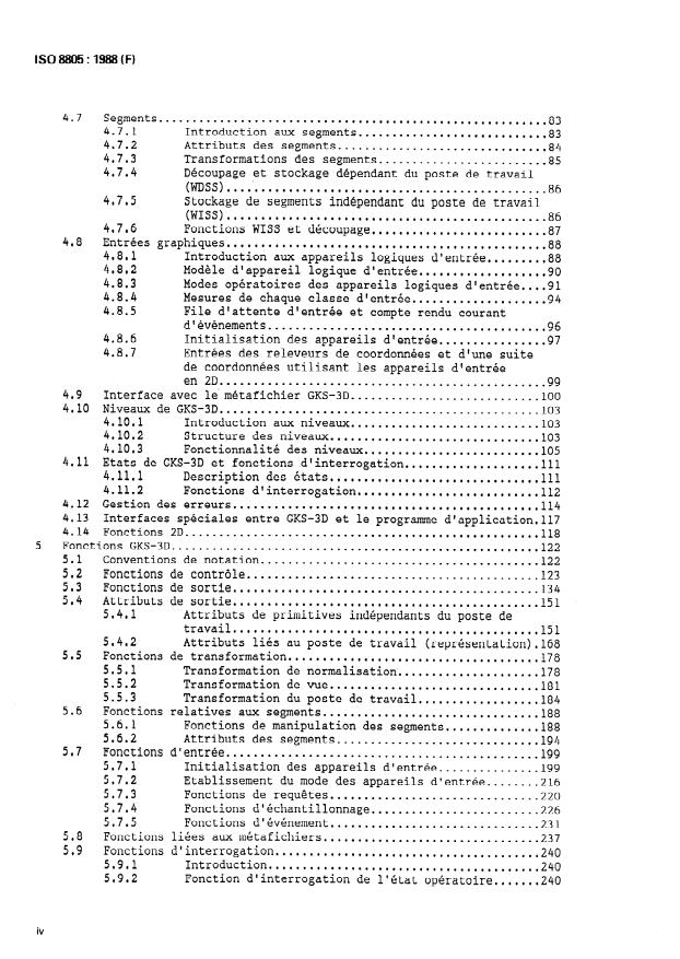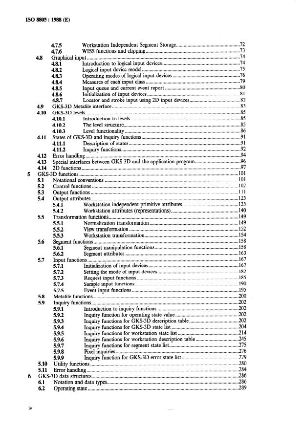 ISO 8805:1988 defines the functional description of the Graphical Kernel System for Three Dimensions (GKS-3D). It specifies a standardized set of functions for computer graphics programming that form a basic graphics system for producing computer-generated three‑dimensional pictures on graphics output devices. The standard covers how application programs define and display 3D graphical primitives (using 3D coordinates), store and retrieve graphics from external metafiles, and generate output primitives with upward‑compatible levels of capability.