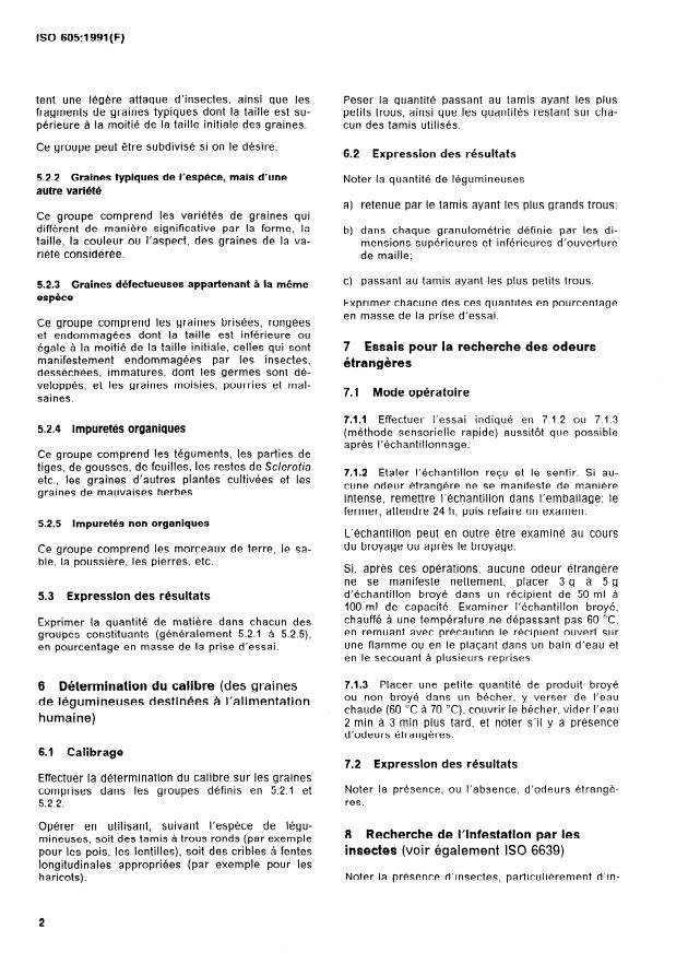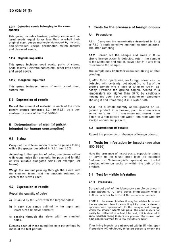 ISO 605:1991 - Pulses -- Determination of impurities, size, foreign odours, insects, and species and variety -- Test methods
