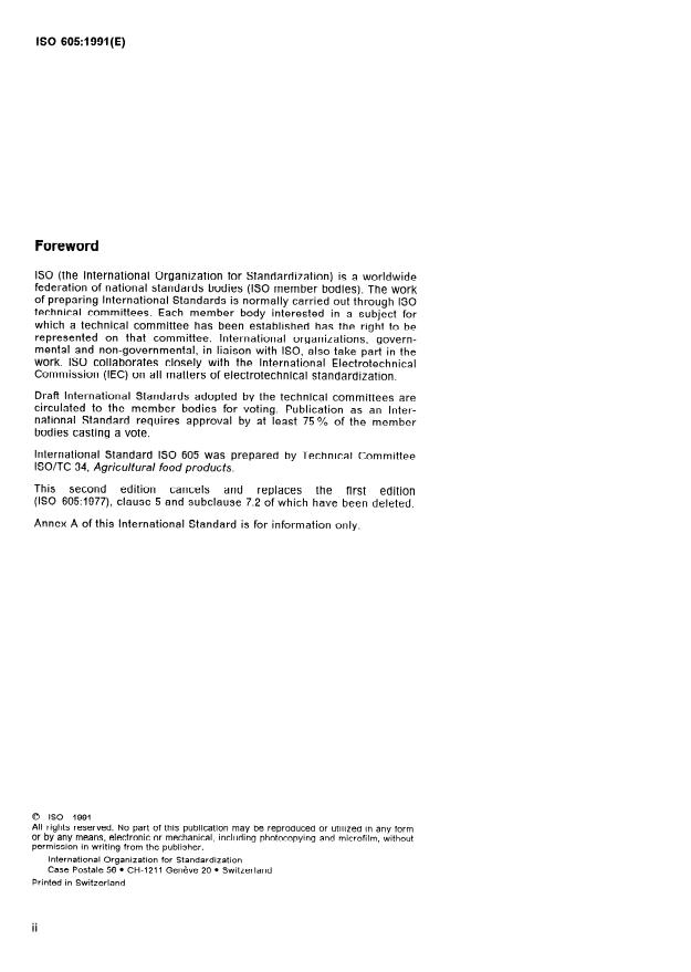 ISO 605:1991 is an international standard developed by the International Organization for Standardization (ISO) under Technical Committee ISO/TC 34, focused on agricultural food products. This second edition, published in 1991, specifies standardized test methods for determining the quality of pulses. It covers procedures for sampling, sample preparation, and tests to identify impurities, pulse size, foreign odours, insect infestation, and the species and variety of pulses. The standard replaces the original 1977 edition, refining testing approaches and enhancing clarity.