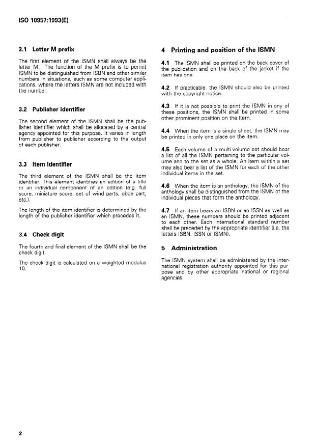 ISO 10957:1993 is a standard published by the International Organization for Standardization (ISO). Its full title is "Information and documentation — International standard music number (ISMN)". This standard covers: Specifies a means of uniquely identifying printed music publications. Standardizes and promotes internationally the use of numbers on printed music publications in order that one edition of a title or one separate component of an edition can be distinguished from all other editions or components by means of a unique international standard music number made up of the following elements: preceded by the letters ISMN, the letter M as a prefix, a publisher identifier, an item identifier, a check digit. Also specifies the location of the number on printed music publications.