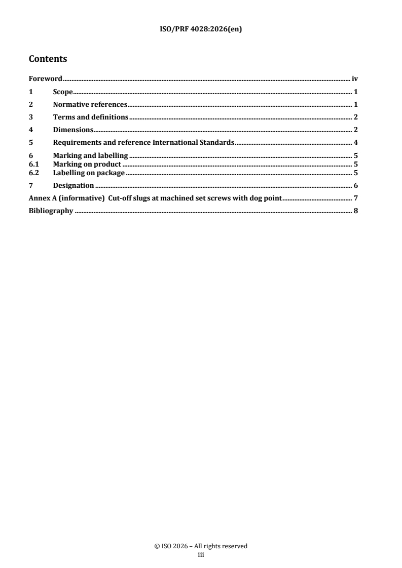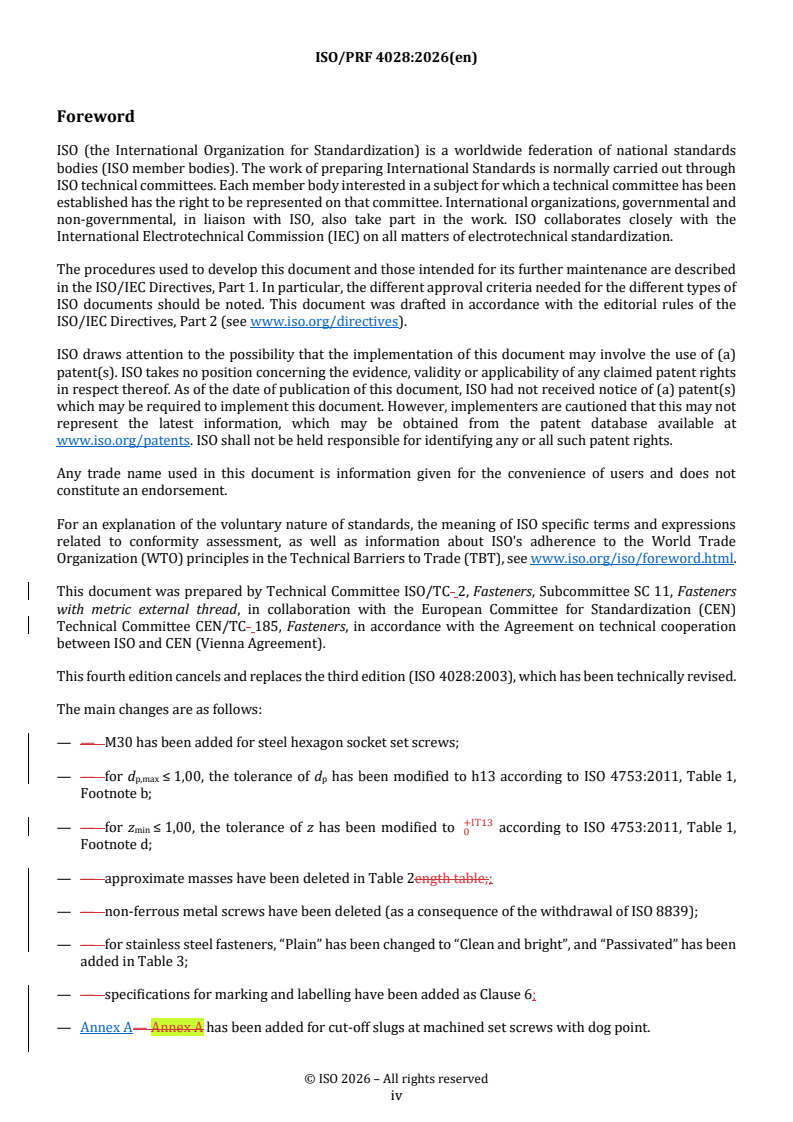ISO/PRF 4028:2026 is an international standard specifying the characteristics and requirements for hexagon socket set screws with dog point, covering metric coarse pitch threads from M1.6 up to M30 for steel, and M1.6 to M24 for stainless steel, with product grade A. This updated edition replaces ISO 4028:2003 and introduces technical revisions focusing on improved tolerances, expanded size ranges, and enhanced specifications for marking and surface treatments.