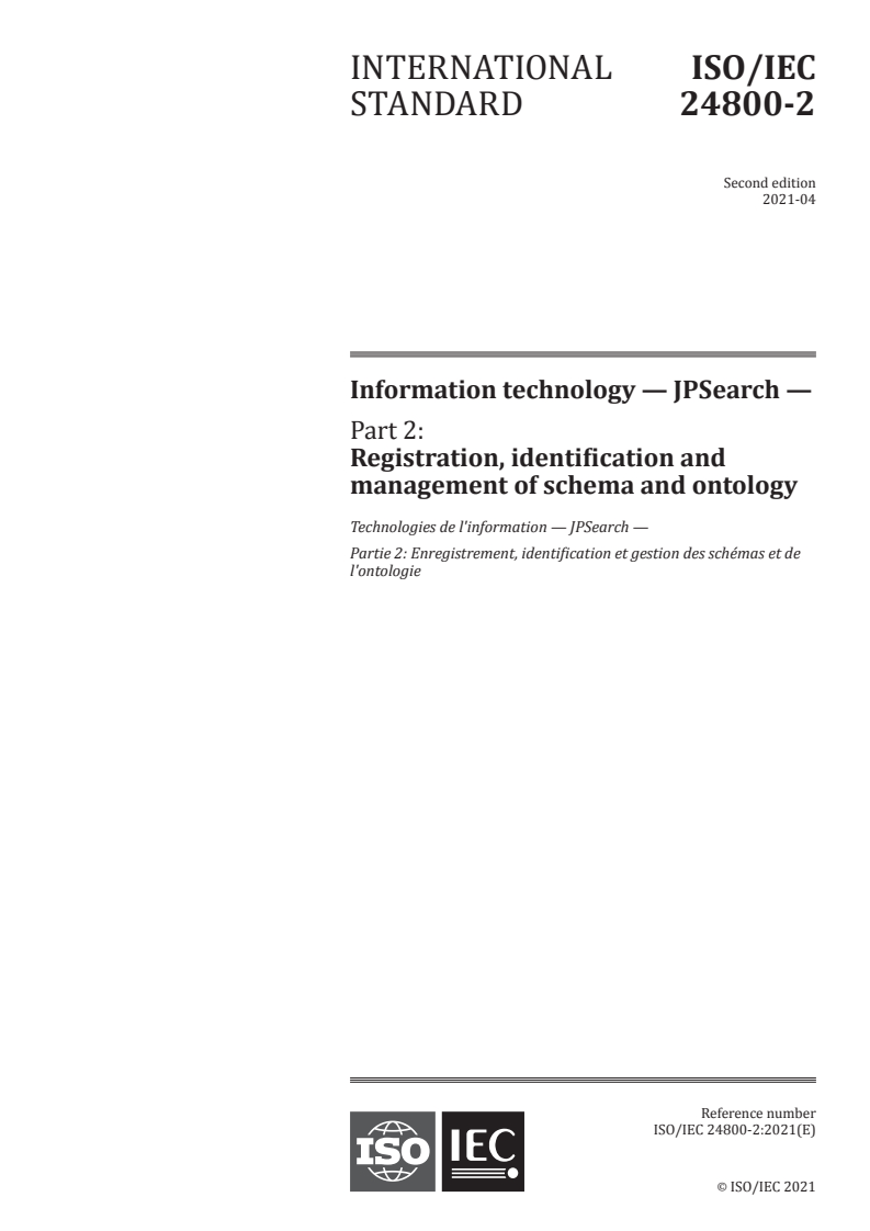 ISO/IEC 24800-2:2021 - Information technology — JPSearch — Part 2: Registration, identification and management of schema and ontology Released:4/13/2021