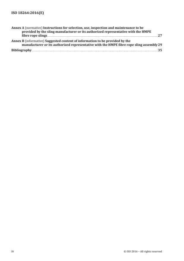 ISO 18264:2016 specifies the requirements related to safety, including methods of rating and testing eye-and-eye and endless sling constructions used as single (1) leg, two (2) leg, three (3) leg or four (4) leg lifting configurations (with and without fittings).These sling constructions are made of 8-strand braided ropes (type L), 12-strand braided ropes (type T), covered rope constructions (type C) according to ISO 10325. Alternatively, other laid and braided rope constructions deviating from ISO 10325, but tested according to ISO 2307, may be used. This International Standard is applicable to rope constructions made of High Modulus Polyethylene [HMPE, also referred to as Ultra High Molecular Weight Polyethylene (UHMWPE)] fibre having a minimum reference number of 12 and a maximum reference number of 72, even though there is no direct link between rope reference numbers and the type of lifting operations, either general-purpose or special lifting operations. Parts of the braided load bearing constructions in such slings, or the whole sling, can be enclosed in a protective cover/jacket/sleeve. The protective cover/jacket/sleeve is designed to be non-load bearing as it is intended only for protection and containment of the load bearing core. The fibre rope slings covered by this International Standard are intended for general-purpose lifting operations only, i.e. when used for lifting objects, materials or goods which require no deviations from the requirements, safety factors, also referred to as design factors, or work load limits specified. Lifting operations not covered by this International Standard would include the lifting of persons, potentially dangerous materials such as molten metal and acids, glass sheets, fissile materials, nuclear reactors and special lifting operations. ISO 18264:2016 deals with the technical requirements to minimize the hazards listed in Clause 4 which can arise during the use of fibre rope slings when carried out in accordance with the instructions and specification given by the manufacturer, its authorized representative or qualified and/or competent person.