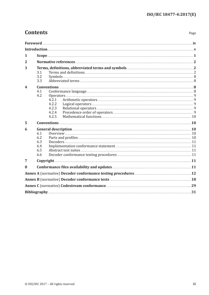ISO/IEC 18477-4:2017 is a standard published by the International Organization for Standardization (ISO). Its full title is "Information technology — Scalable compression and coding of continuous-tone still images — Part 4: Conformance testing". This standard covers: ISO/IEC 18477-4:2017 specifies the framework, concepts, methodology for testing, and criteria to be achieved to claim conformance to one or multiple parts of ISO/IEC 18477 as listed below. It provides a framework for specifying abstract test suites and for defining the procedures to be followed during conformance testing. ISO/IEC 18477-4:2017 - specifies conformance testing procedures for decoding of ISO/IEC 18477‑1, 18477-2, ISO/IEC 18477‑6, ISO/IEC 18477‑7, ISO/IEC 18477‑8 and ISO/IEC 18477‑9, - specifies conformance testing procedures for codestreams to the above International Standards, - specifies codestreams, decoded images, and error metrics to be used within the decoder testing procedures, and - specifies abstract test suites.