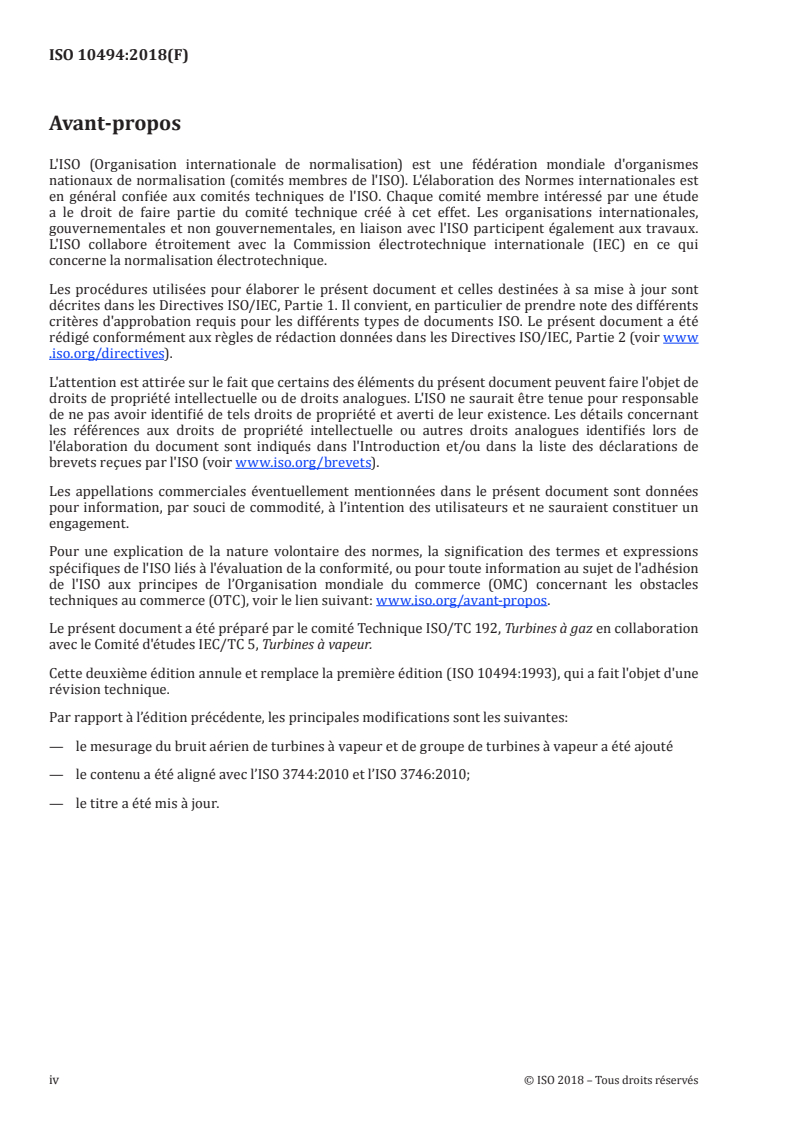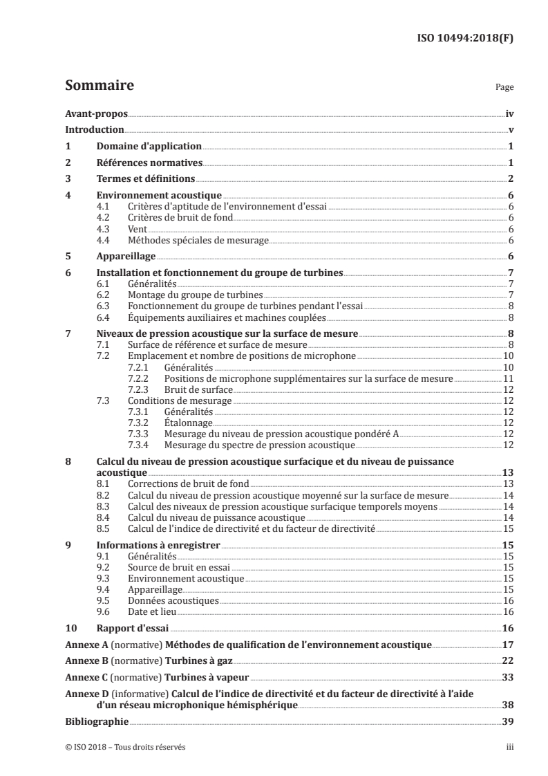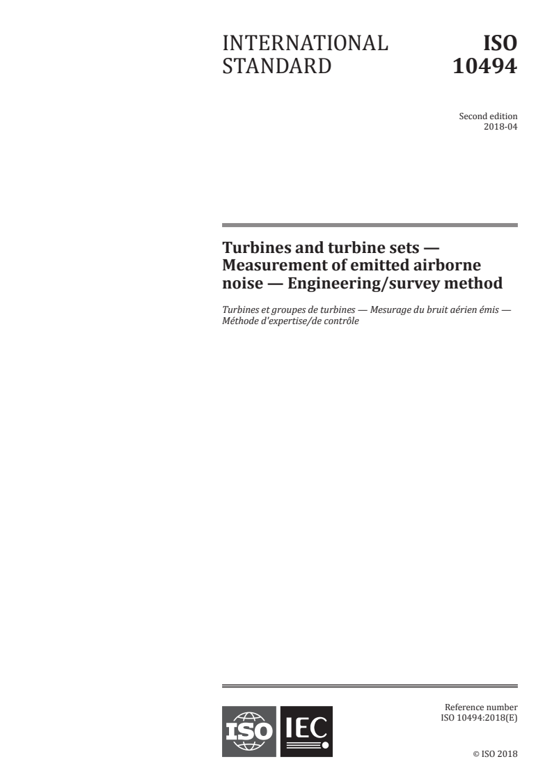 ISO 10494:2018 is a standard published by the International Organization for Standardization (ISO). Its full title is "Turbines and turbine sets — Measurement of emitted airborne noise — Engineering/survey method". This standard covers: ISO 10494:2018 specifies methods for measuring the noise emission of a turbine or turbine set under steady-state operating conditions. It specifies methods for measuring the sound pressure levels on a measurement surface enveloping a source, and for calculating the sound power level produced by the source. It gives requirements for the test environment and instrumentation, as well as techniques for obtaining the surface sound pressure level from which the A-weighted sound power level of the source and octave or one-third-octave band sound power levels are calculated. These methods can be used to conduct performance tests even if the purpose of the test is simply to determine the sound pressure level around the machine. ISO 10494:2018 is applicable to turbines and turbine sets: - for power plant and industrial applications (e.g. stationary); - for installation on board ships, or offshore installations, road and railway vehicles. ISO 10494:2018 does not apply to gas turbines in aircraft applications. ISO 10494:2018 is applicable to only the part of the turbine set (turbine, driven equipment and attached components) located above the floor and inside a continuous enveloping measurement surface bounded by this floor. ISO 10494:2018 is applicable to steady-state operation and excludes transients such as start-up and shut-down, when the noise emission can be higher for short times. Under these conditions, this document does not apply.