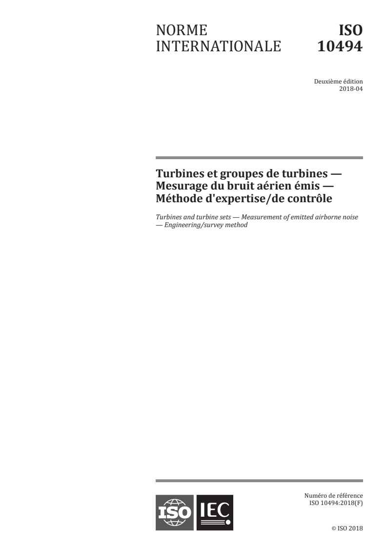 ISO 10494:2018 - Turbines et groupes de turbines -- Mesurage du bruit aérien émis -- Méthode d'expertise/de contrôle