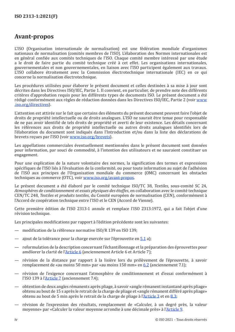 ISO 2313-1:2021 - Textiles -- Détermination de l’auto-défroissabilité d’une éprouvette d’étoffe pliée, par mesurage de l’angle rémanent après pliage