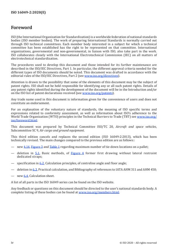ISO 16049-2:2020 is a standard published by the International Organization for Standardization (ISO). Its full title is "Air cargo equipment — Restraint straps — Part 2: Utilization requirements and recommendations and lashing calculations". This standard covers: This document aims at providing general utilization requirements and recommendations and calculation methods adequate to guarantee the effectiveness and ultimate load strength of tie-down/lashing arrangements performed to restrain cargo on board civil transport aircraft during flight: a) cargo loaded and tied down onto airworthiness approved air cargo pallets, themselves restrained into aircraft lower deck or main deck or upper deck cargo systems meeting the restraint requirements of air cargo pallets approved in accordance with ISO 8097 (NAS3610) or ISO 21100, or b) additional tie-down on aircraft structure when necessitated by pallet maximum gross mass or centre of gravity limits, or c) non-unitized individual pieces of cargo, or pieces of cargo placed onto an unrestrained ("floating") pallet into either lower deck, main deck or upper deck containerized cargo compartments of an aircraft, or d) individual pieces of load loaded in non-containerized (bulk loaded) baggage or cargo compartments. This document applies to cargo tie-down/lashing arrangements using exclusively air cargo restraint straps conforming to ISO 16049-1. Its general recommendations may also be used for tie-down arrangements using other means (e.g. steel cables, rope, other types of straps), but under the user's responsibility as to their adequacy and the strength calculations required. NOTE 1 Where tie-down is performed onto aircraft structure as per b) or c) above, additional restrictions can be stated in the aircraft's Authority approved Weight and Balance Manual. NOTE 2 The use of chains, rods, or other rigid devices for tie-down onto civil transport aircraft floor tracks, which can generate excessive stress in the aircraft structure, is not part of the scope of this document. . This document aims at providing industry recognized means of complying with Airworthiness Authorities general requirements applicable to load securing on board civil transport aircraft (see CCAR-25, JAS Part 3, 14 CFR Part 25 and EASA CS-25), and aircraft manufacturers Authority approved Weight and Balance Manuals for each aircraft type as specified therein. It is not the intent of this document to specify when restraint straps should be used, but how they should be used. Meeting the methods requirements of this document is not alone sufficient to ensure flight safety: this document is based on the assumption that cargo tie-down will be designed, performed, and checked prior to aircraft departure in accordance with appropriate operating instructions conforming to the Weight and Balance Manual of the aircraft concerned, by competent, suitably trained, personnel as defined for example in ISO 9001:2015, 6.2.2 (see Clause 8).