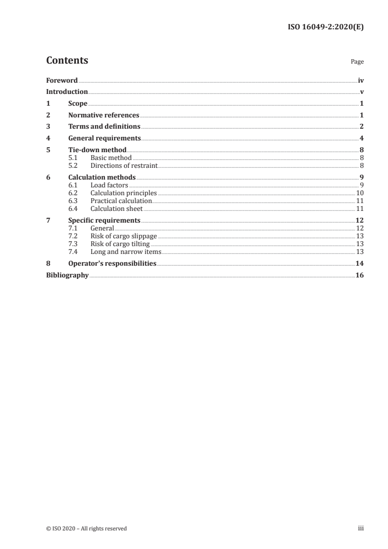 This document aims at providing general utilization requirements and recommendations and calculation methods adequate to guarantee the effectiveness and ultimate load strength of tie-down/lashing arrangements performed to restrain cargo on board civil transport aircraft during flight: a) cargo loaded and tied down onto airworthiness approved air cargo pallets, themselves restrained into aircraft lower deck or main deck or upper deck cargo systems meeting the restraint requirements of air cargo pallets approved in accordance with ISO 8097 (NAS3610) or ISO 21100, or b) additional tie-down on aircraft structure when necessitated by pallet maximum gross mass or centre of gravity limits, or c) non-unitized individual pieces of cargo, or pieces of cargo placed onto an unrestrained ("floating") pallet into either lower deck, main deck or upper deck containerized cargo compartments of an aircraft, or d) individual pieces of load loaded in non-containerized (bulk loaded) baggage or cargo compartments. This document applies to cargo tie-down/lashing arrangements using exclusively air cargo restraint straps conforming to ISO 16049-1. Its general recommendations may also be used for tie-down arrangements using other means (e.g. steel cables, rope, other types of straps), but under the user's responsibility as to their adequacy and the strength calculations required. NOTE 1 Where tie-down is performed onto aircraft structure as per b) or c) above, additional restrictions can be stated in the aircraft's Authority approved Weight and Balance Manual. NOTE 2 The use of chains, rods, or other rigid devices for tie-down onto civil transport aircraft floor tracks, which can generate excessive stress in the aircraft structure, is not part of the scope of this document. . This document aims at providing industry recognized means of complying with Airworthiness Authorities general requirements applicable to load securing on board civil transport aircraft (see CCAR-25, JAS Part 3, 14 CFR Part 25 and EASA CS-25), and aircraft manufacturers Authority approved Weight and Balance Manuals for each aircraft type as specified therein. It is not the intent of this document to specify when restraint straps should be used, but how they should be used. Meeting the methods requirements of this document is not alone sufficient to ensure flight safety: this document is based on the assumption that cargo tie-down will be designed, performed, and checked prior to aircraft departure in accordance with appropriate operating instructions conforming to the Weight and Balance Manual of the aircraft concerned, by competent, suitably trained, personnel as defined for example in ISO 9001:2015, 6.2.2 (see Clause 8).
