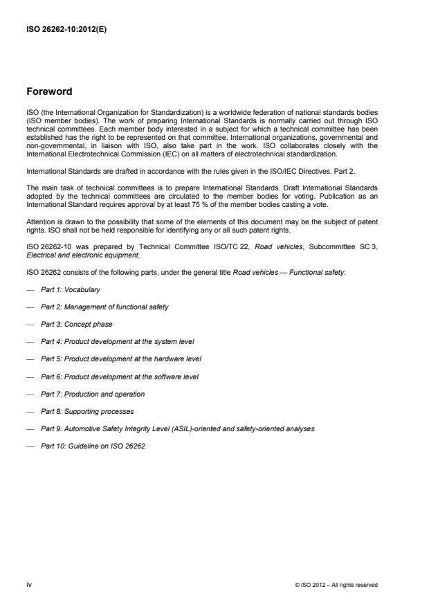 ISO 26262-10:2012 is a standard published by the International Organization for Standardization (ISO). Its full title is "Road vehicles — Functional safety — Part 10: Guideline on ISO 26262". This standard covers: ISO 26262 is intended to be applied to safety-related systems that include one or more electrical and/or electronic (E/E) systems and that are installed in series production passenger cars with a maximum gross vehicle mass up to 3 500 kg. ISO 26262 does not address unique E/E systems in special purpose vehicles such as vehicles designed for drivers with disabilities. Systems and their components released for production, or systems and their components already under development prior to the publication date of ISO 26262, are exempted from the scope. For further development or alterations based on systems and their components released for production prior to the publication of ISO 26262, only the modifications will be developed in accordance with ISO 26262. ISO 26262 addresses possible hazards caused by malfunctioning behaviour of E/E safety-related systems, including interaction of these systems. It does not address hazards related to electric shock, fire, smoke, heat, radiation, toxicity, flammability, reactivity, corrosion, release of energy and similar hazards, unless directly caused by malfunctioning behaviour of E/E safety-related systems. ISO 26262 does not address the nominal performance of E/E systems, even if dedicated functional performance standards exist for these systems (e.g. active and passive safety systems, brake systems, Adaptive Cruise Control). ISO 26262-10:2012 provides an overview of ISO 26262, as well as giving additional explanations, and is intended to enhance the understanding of the other parts of ISO 26262. It describes the general concepts of ISO 26262 in order to facilitate comprehension. The explanation expands from general concepts to specific contents. In the case of inconsistencies between ISO 26262-10:2012 and another part of ISO 26262, the requirements, recommendations and information specified in the other part of ISO 26262 apply.